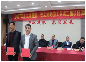 集團(tuán)公司副總經(jīng)理胡萍同志宣講了《關(guān)于表彰2017年度獲獎(jiǎng)工程項(xiàng)目的決定》決定對(duì)集團(tuán)公司2017年度榮獲的7個(gè)工程質(zhì)量及5個(gè)安全文明施工工程項(xiàng)目進(jìn)行了表彰,并由武漢市建筑業(yè)協(xié)會(huì)副會(huì)長(zhǎng)兼秘書長(zhǎng)李淼磊、中杰投資公司董事長(zhǎng)池建國(guó)、勞動(dòng)街辦事處黃主任及鳴辰集團(tuán)公司董事長(zhǎng)王春才為保利時(shí)代K18地塊A、B棟及地下室工程、高雄壹號(hào)工程、幸福灣二期工程、保利清能西海岸北區(qū)五期工程、祥運(yùn)鞋業(yè)生產(chǎn)車間工程等受表彰的項(xiàng)目進(jìn)行了頒獎(jiǎng)。