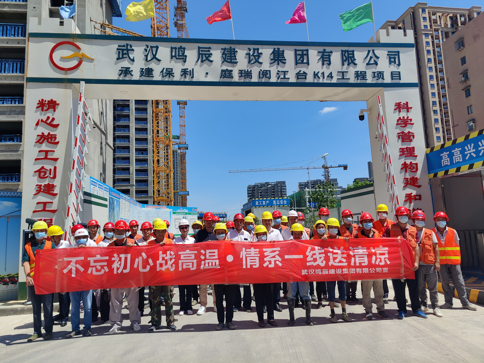公司領(lǐng)導(dǎo)班子要求:高溫天氣,各項(xiàng)目部要按照鳴辰司字(2020)8號(hào)文件《關(guān)于做好夏季高溫施工質(zhì)量、安全生產(chǎn)的通知》通知精神部積極做好防暑降溫工作,為一線施工人員營(yíng)造一個(gè)良好的施工環(huán)境,做好夏季高溫工程質(zhì)量控制及安全生產(chǎn),戰(zhàn)高溫、斗酷暑,再接再厲,爭(zhēng)取把被疫情耽誤的時(shí)間趕回來(lái)。