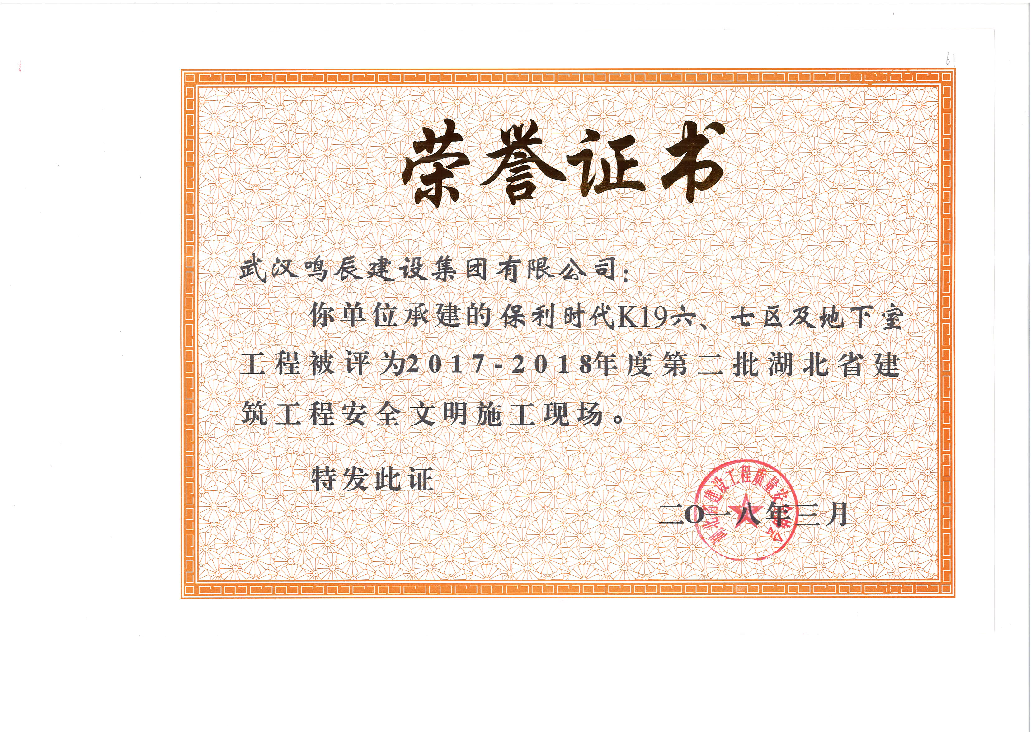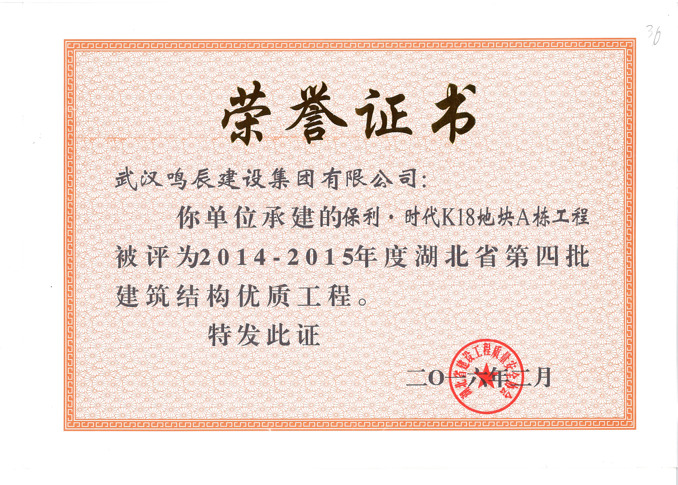 保利時(shí)代K18地塊A棟工程被評為2014-2015年度湖北省第四批建筑結(jié)...