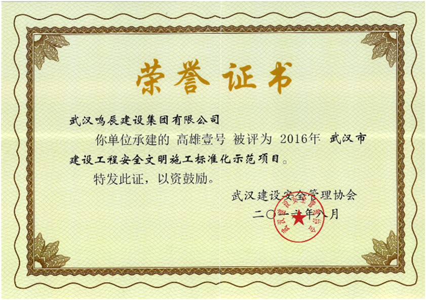 高雄壹號被評為2016年武漢市建設(shè)工程安全文明施工標(biāo)準(zhǔn)化示范項(xiàng)目