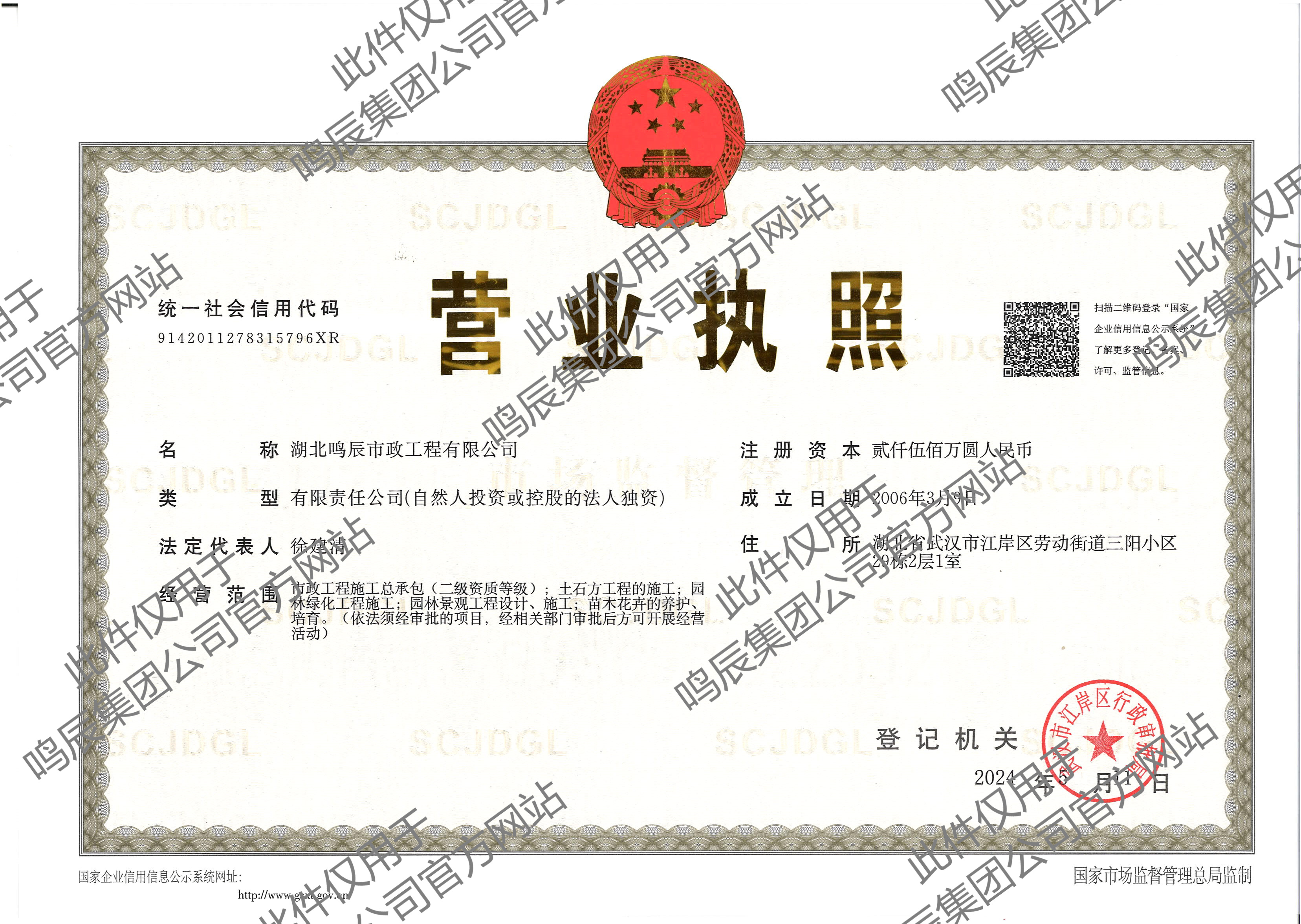 湖北鳴辰市政工程有限公司成立于2006年,屬武漢鳴辰建設集團有限公司的全資子公司,注冊資本金2500萬元,具備市政工程施工總承包貳級資質。經營范圍包括:市政道路工程施工,土石方工程施工,園林綠化工程施工,園林景觀工程設計、施工,苗木花卉的養(yǎng)護、培育等。