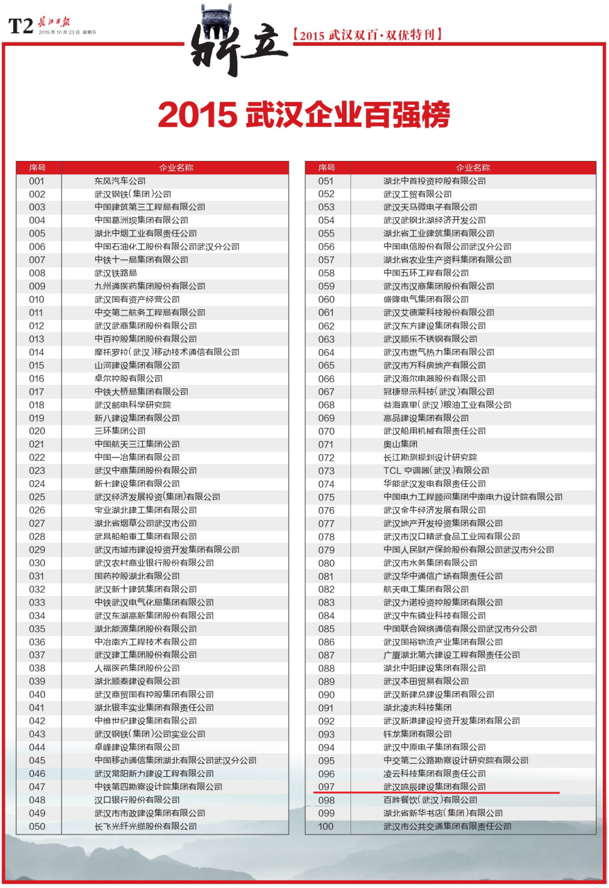 武漢鳴辰建設(shè)集團(tuán)有限公司榮獲武漢企業(yè)100強(qiáng)97位、武漢民營(yíng)企業(yè)100強(qiáng)34位,該決定轉(zhuǎn)載自武企聯(lián)合網(wǎng)網(wǎng)站