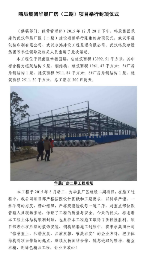 鳴辰集團華晨廠房(二期)項目舉行封頂儀式