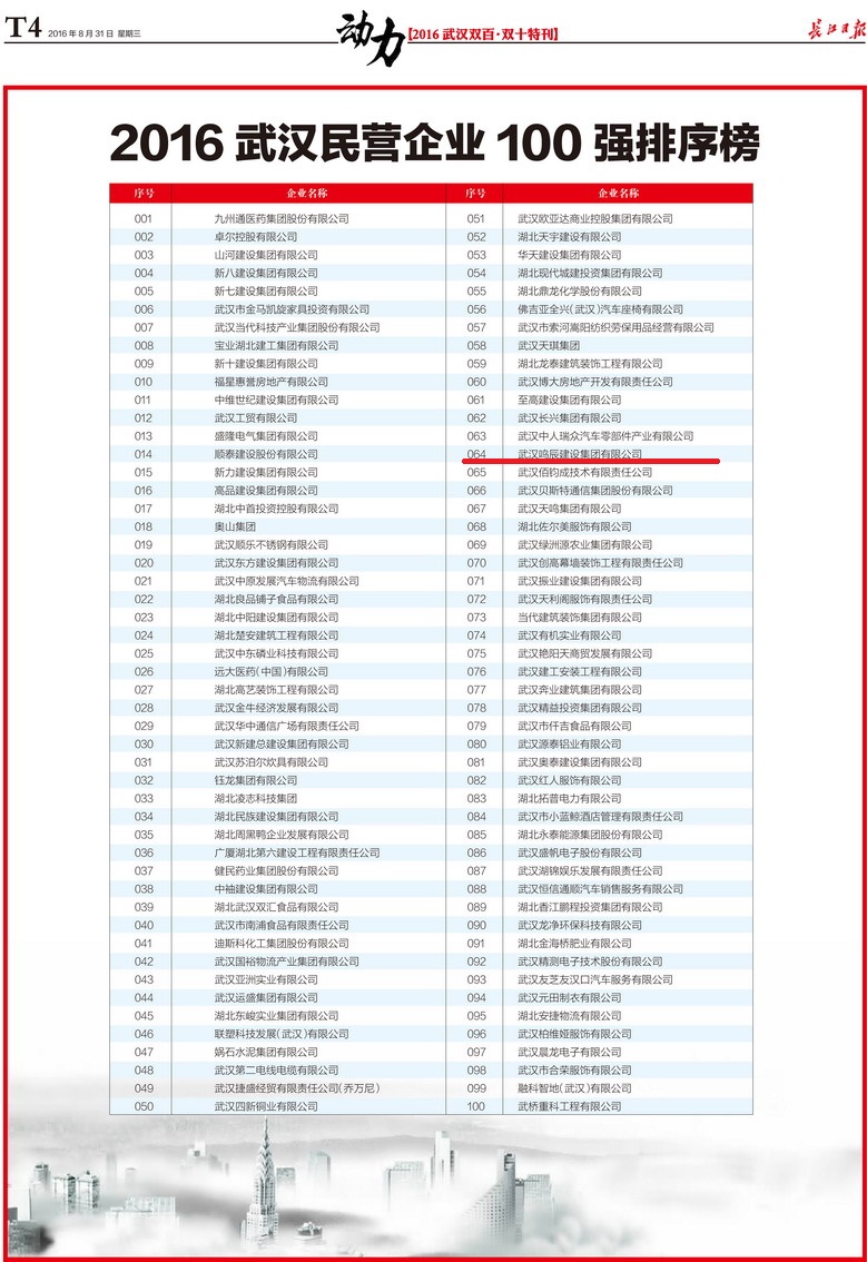武漢鳴辰建設(shè)集團(tuán)有限公司在“2016年武漢雙百強(qiáng)企業(yè)評比”中榮獲“武漢民營企業(yè)100強(qiáng)”稱號,相關(guān)新聞:http://cjrb.cjn.cn/images/2016-08/31/20/2016083120_pdf.pdf