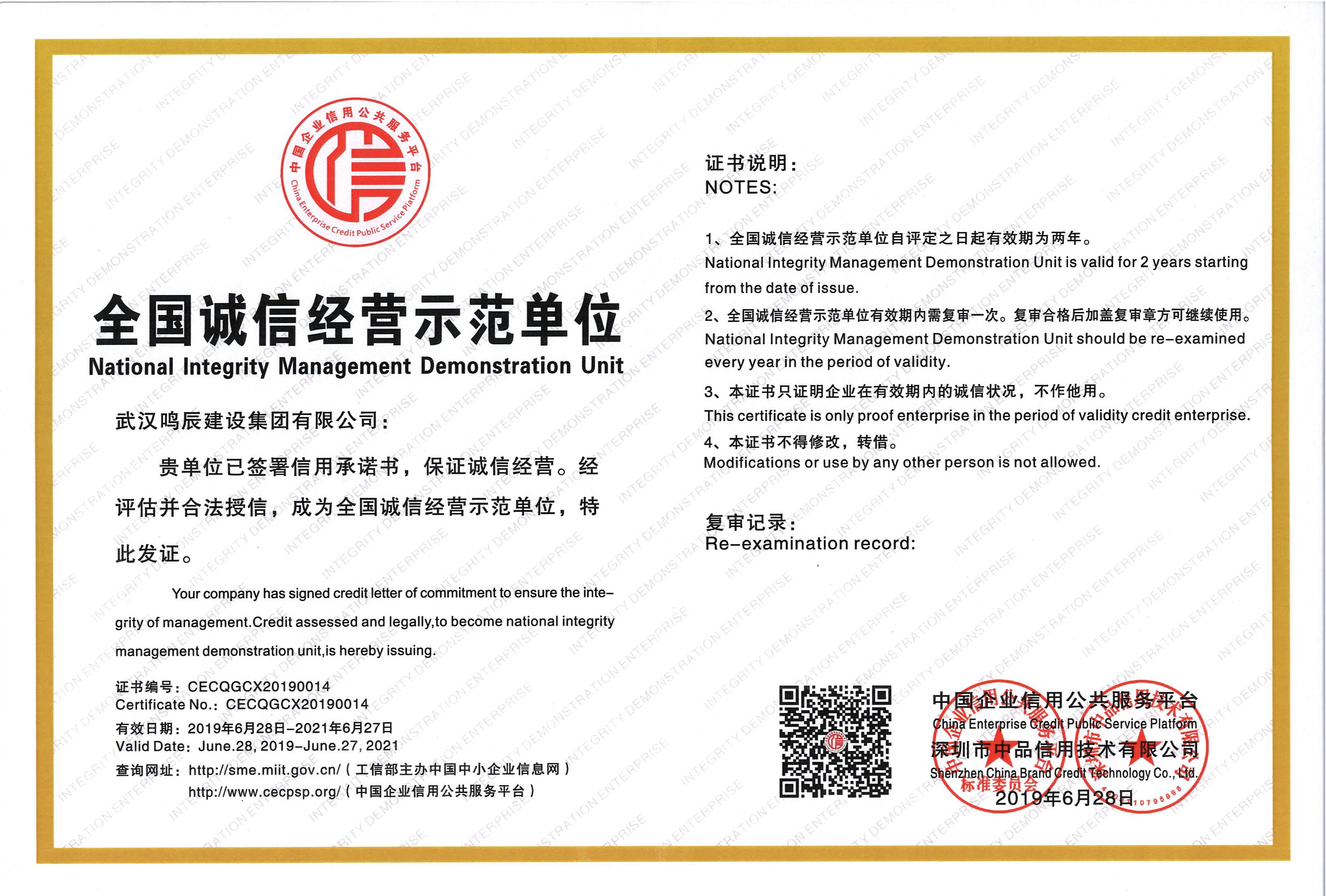 全國誠信經(jīng)營示范單位